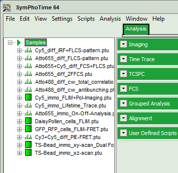 Note: The “Samples” workspace is delivered with the SymPhoTime 64 on a DVD-ROM and contains example data to show the function of the SymPhoTime data analysis. If you haven't installed it on your computer, copy it from the DVD onto a local drive before going through this tutorial.