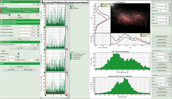 The time traces can be acquired from single molecule events in a diluted solution, where the passages of single molecules are registered as “bursts”. Alternatively, traces obtained from a stationary single FRET pair can be analyzed, e.g. to observe conformational changes.