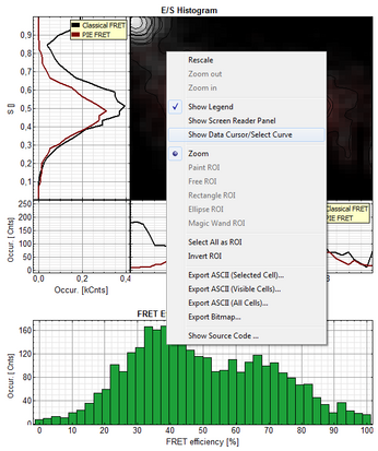 - If the FRET efficiencies of the two peaks should be indicated, place the mouse cursor over the graph, activate the context menu by a right mouse click and select “Show Data Reader/Select Curve”.