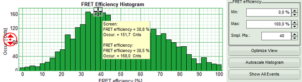 Note: The parameter “Min. Photons per FRET Event” is by default set to 25. In order to calculate distinct FRET efficiencies, a much lower parameter does not make sense, as the possible values for the FRET efficiencies are otherwise too much determined by the photon numbers of the event. For example, in a burst with just 10 photons, only 11 FRET values are numerically possible, which is quite rough.
