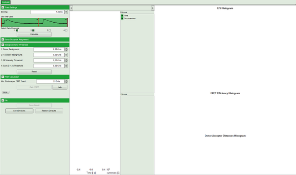 - Right: FRET distribution histogram and the FRET radius histogram. As these distributions have not been calculated yet, this area is still empty.