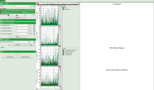 - The FRET efficiencies are calculated, The E/S-histogram graph is plotted, and the “FRET Efficiency” and “Donor-Acceptor Distances” histograms are drawn in the lower part of the image.